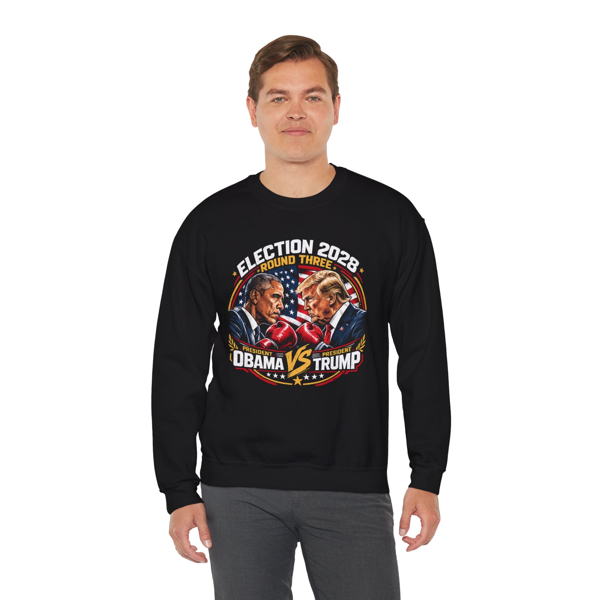 Shop our Election 2028 crewneck sweatshirts featuring Obama vs Trump satirical designs....